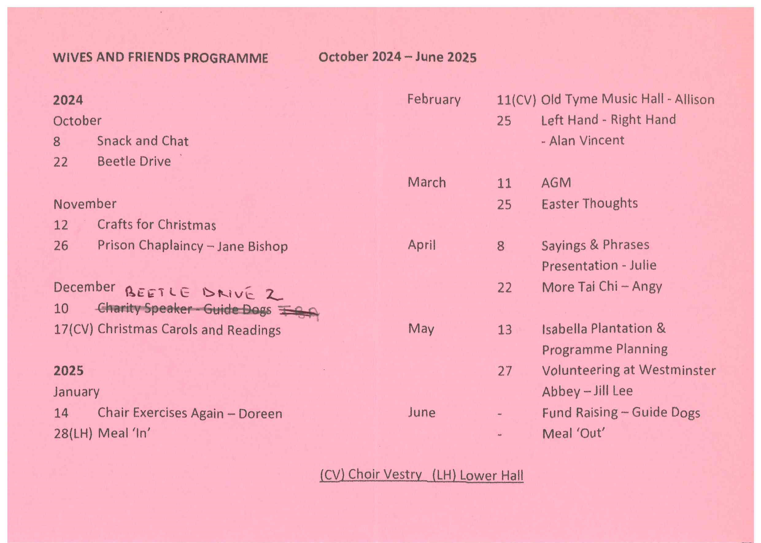 Wives and Friends meets roughly twice a month in Wesley's at the front of the church, on a Tuesday evening at 7.30pm. There is a varied programme, often including outside speakers, and a range of interesting topics are covered. Please contact nmmc@hotmail.co.uk for details. Please click here for the 2024/2025 Programme. Occasionally the meetings take place in other parts of the building which are marked on the programme.